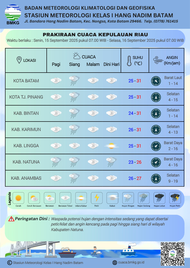 BATAM, Kepri.info – Badan Meteorologi, Klimatologi dan Geofisika (BMKG) Meteorologi Kelas I Hang Nadim Batam memprakirakan kondisi cuaca di tujuh wilayah Kepulauan Riau (Kepri) yang berlaku untuk Senin (15/9/2025) dan Selasa (16/9/2025).