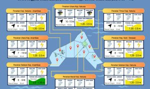 Kemudian, di Perairan Selatan Natuna, diprakirakan pagi hari hujan ringan hingga malam, dini hari berawan tebal, angin bertiup dari arah barat daya dengan Kecepatan angin 8-12 Knot, dan tinggi gelombang 1.25-2.5 meter.