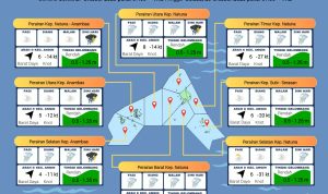 Sementara itu, di Perairan Timur Natuna, diprakirakan pagi hari hujan ringan hingga dini hari, angin bertiup dari arah barat daya dengan Kecepatan angin 7-27 Knot, dan tinggi gelombang 0.5-1.25 meter.