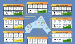 Kemudian, di Perairan Selatan Natuna, diprakirakan pagi hari hingga dini hari hujan ringan angin bertiup dari arah barat dengan Kecepatan angin 4-8 Knot, dan tinggi gelombang 0.5- 1.25 meter.