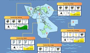 “Potensi ketinggian gelombang yang dapat mencapai 2.4 meter diwilayah perairan Batam, Natuna, Anambas,Tambelan, Bintan, dan Lingga pada tanggal 13 November 2025. Untuk 14 November 2025 ketinggian gelombang mencapai 2.2 meter di perairan Anambas, Natuna, Natuna dan Tambelan, lalu ketinggian gelombang mencapai 2.1 meter di wilayah Bintan, Natuna, Anambas dan Tambelan pada 15 November 2025, ditetapkan dalam kategori waspada,” tulisnya dirilis update prakiraan cuaca.