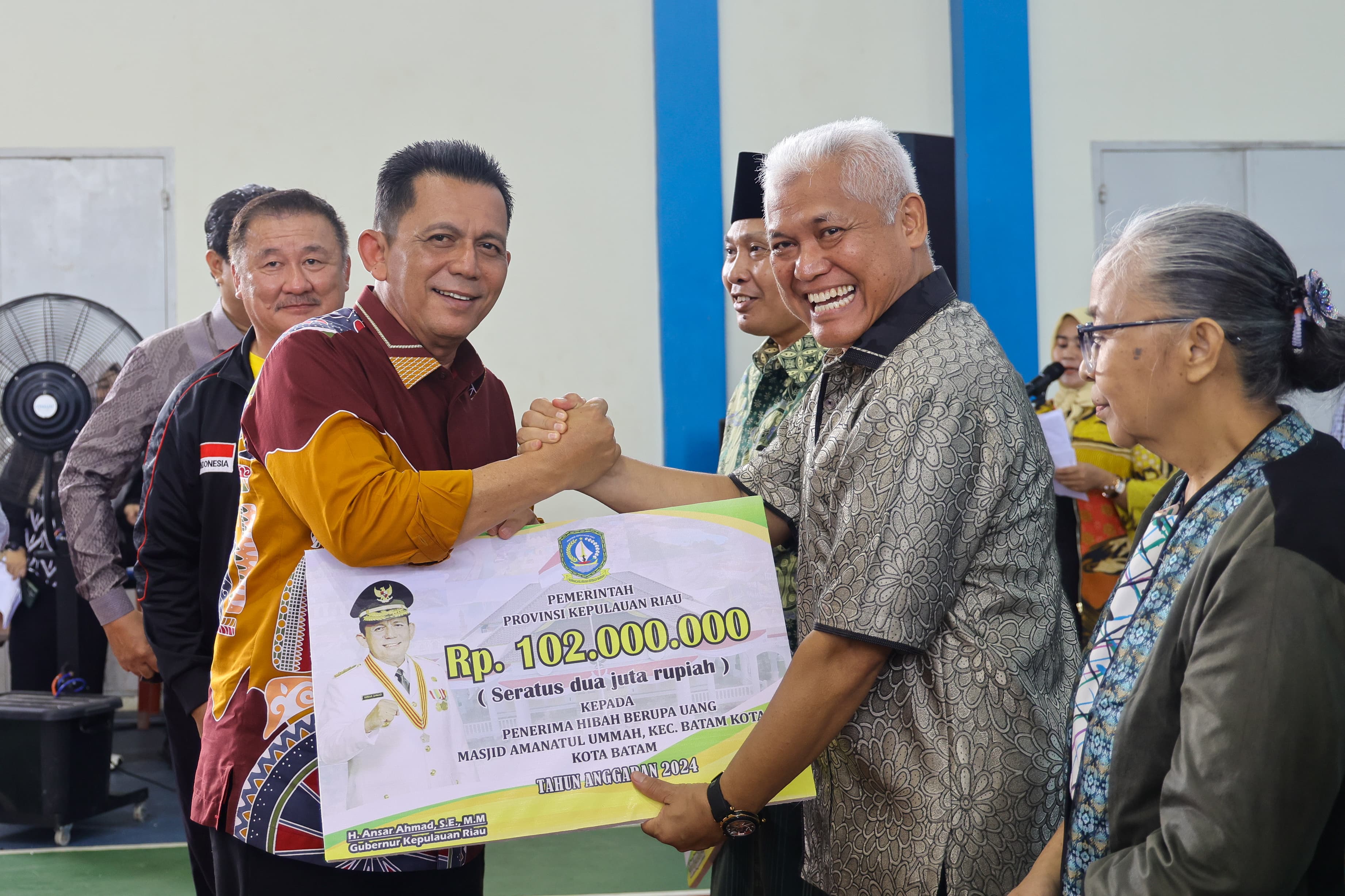 Gubernur Kepri Ansar Ahmad saat menyerahkan bantuan di Batam, Sabtu, 10/8/2024 (Diskominfo Kepri)