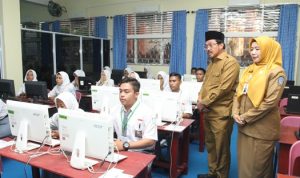 Gubernur Kepri, Nurdin Basirun saat melakukan monitoring UNBK di SMKN 2 Tanjungpianang.