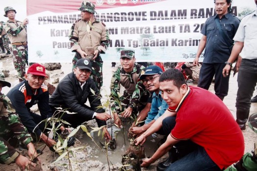 Karimun (Kepri.Info)- Pangkalan TNI Angkatan Laut (Lanal) Tanjung Balai Karimun bekerja sama dengan PT. Timah Tbk mengadakan kegiatan penanaman 1000 bibit mangrove jenis pohon api-api dan perpal di sepanjang bibir pantai Coastal Area, Tanjung Balai Karimun, beberapa waktu lalu.