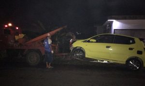Kondisi mobil terlihat rusak parah bagian depan, dan mobil pun diangkut menggukan truk untuk dibawa ke bengkel, beruntung, kejadian tersebut tidak memakan korban. (Nzl)
