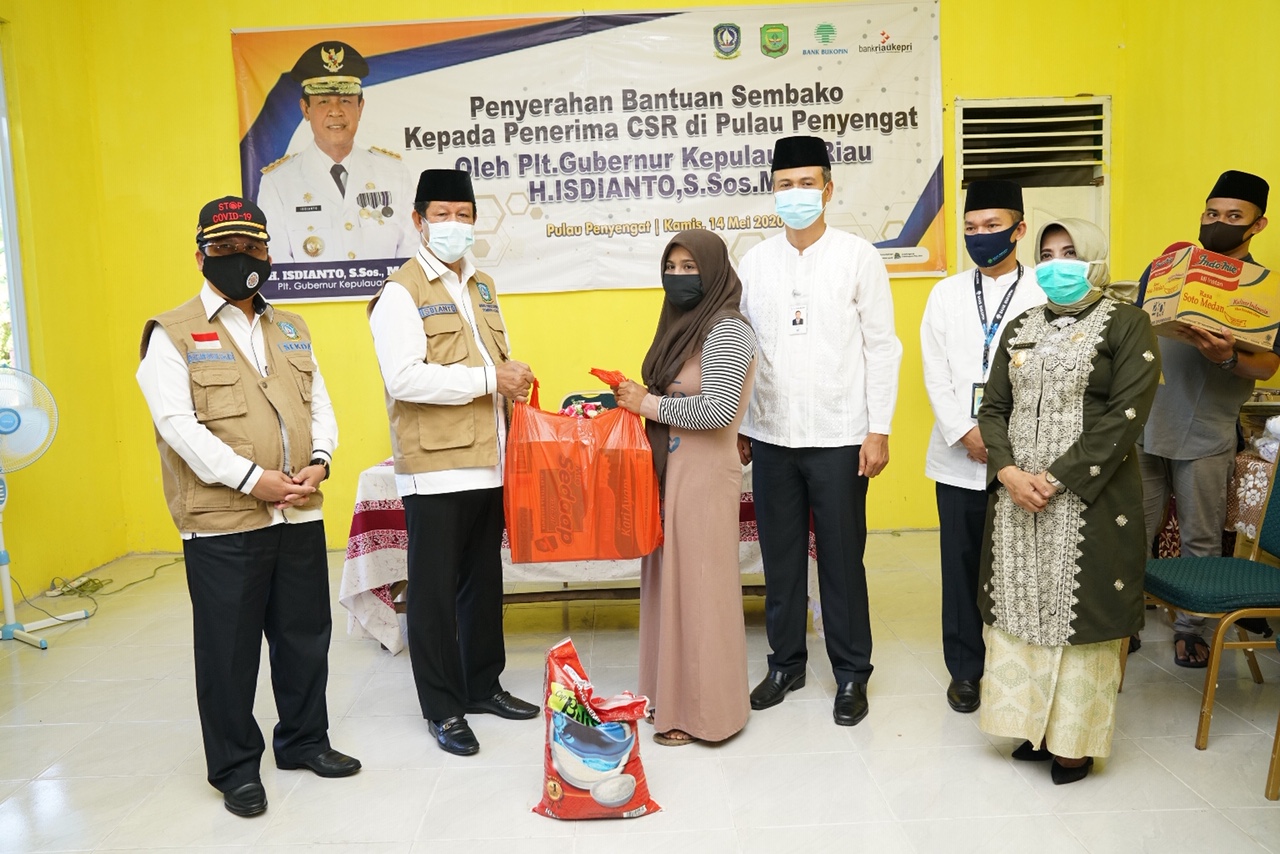 Sebanyak 150 paket sembako CSR diterima masyarakat Pulau Penyengat dari Bank Bukopin dan Bank Riau Kepri, Pemprov pun turut andil menyerahkan bantuan APD berupa 300 masker.