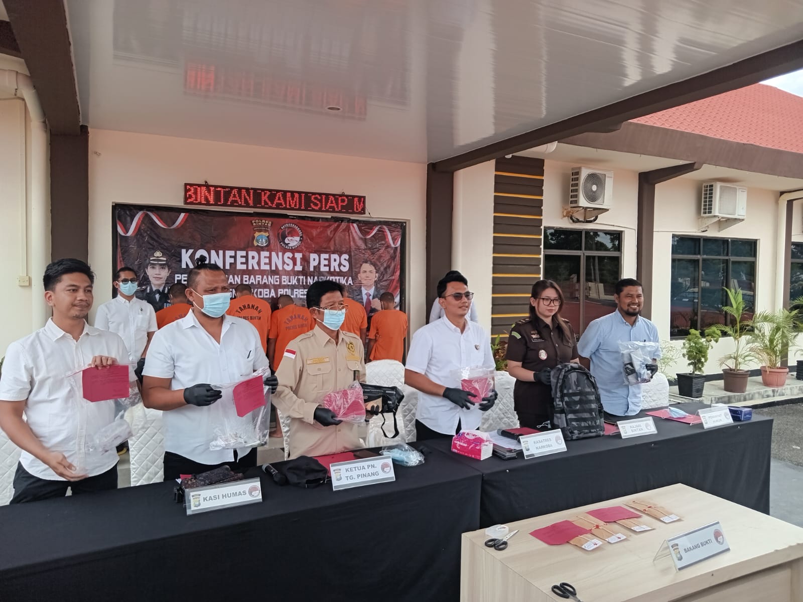 Kasat Narkoba Polres Bintan, Iptu Davinci ( tiga dari kanan) saat melakukan Konfrensi Pers. (Nzl)