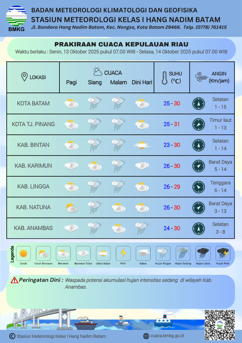 BATAM, Kepri.info – Badan Meteorologi, Klimatologi dan Geofisika (BMKG) Meteorologi Kelas I Hang Nadim Batam memprakirakan kondisi cuaca di tujuh wilayah Kepulauan Riau (Kepri) yang berlaku untuk Senin (13/10/2025) dan Selasa (14/10/2025).