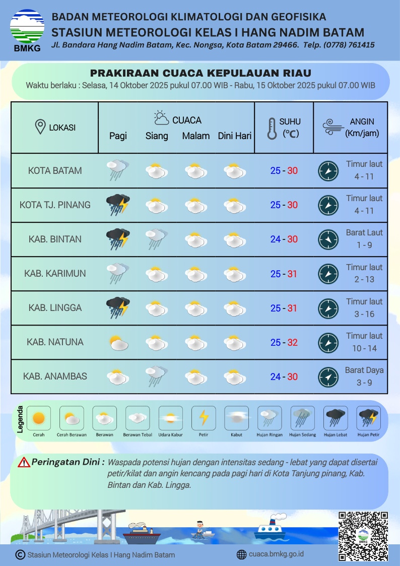 BATAM, Kepri.info – Badan Meteorologi, Klimatologi dan Geofisika (BMKG) Meteorologi Kelas I Hang Nadim Batam memprakirakan kondisi cuaca di tujuh wilayah Kepulauan Riau (Kepri) yang berlaku untuk Selasa (14/10/2025) dan Rabu (15/10/2025).