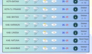 “Secara umum kondisi cuaca di kepri esok hari diprakirakan berawan tebal dan berpotensi terjadinya hujan dengan intensitas ringan hingga sedang yang dapat disertai petir dan angin kencang pada pagi dan siang hari di wilayah, Bintan, Karimun, Anambas, dan Natuna,” tulisnya dirilis update prakiraan cuaca.