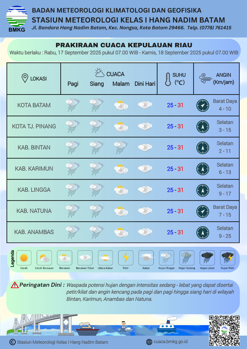 BATAM, Kepri.info – Badan Meteorologi, Klimatologi dan Geofisika (BMKG) Meteorologi Kelas I Hang Nadim Batam memprakirakan kondisi cuaca di tujuh wilayah Kepulauan Riau (Kepri) yang berlaku untuk Rabu (17/9/2025) dan Kamis (16/9/2025).