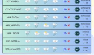 BATAM, Kepri.info – Badan Meteorologi, Klimatologi dan Geofisika (BMKG) Meteorologi Kelas I Hang Nadim Batam memprakirakan kondisi cuaca di tujuh wilayah Kepulauan Riau (Kepri) yang berlaku untuk Senin (01/12/2025) dan Selasa (02/12/2025).