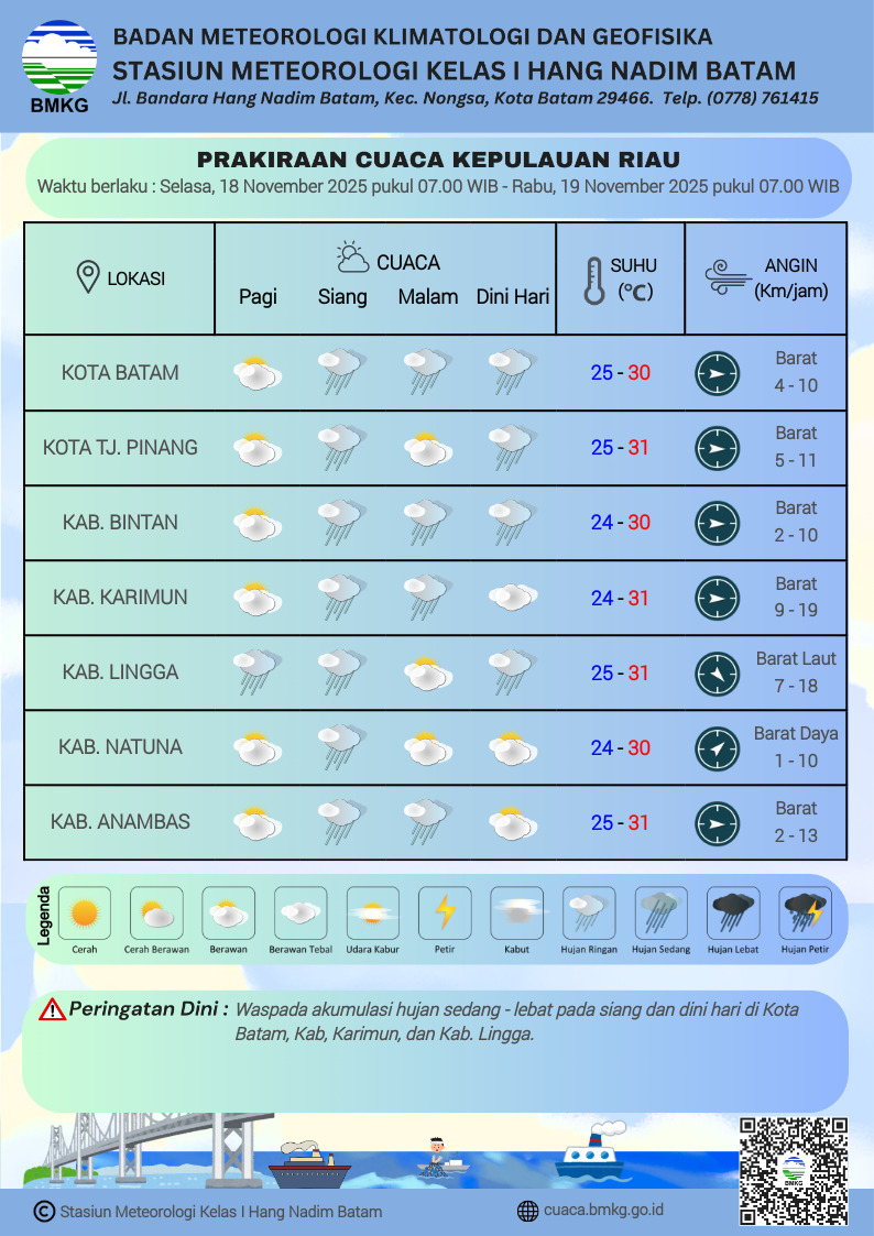 BATAM, Kepri.info – Badan Meteorologi, Klimatologi dan Geofisika (BMKG) Meteorologi Kelas I Hang Nadim Batam memprakirakan kondisi cuaca di tujuh wilayah Kepulauan Riau (Kepri) yang berlaku untuk Rabu (19/11/2025) dan Kamis (20/11/2025).