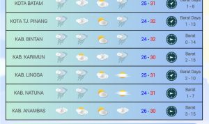 BATAM, Kepri.info – Badan Meteorologi, Klimatologi dan Geofisika (BMKG) Meteorologi Kelas I Hang Nadim Batam memprakirakan kondisi cuaca di tujuh wilayah Kepulauan Riau (Kepri) yang berlaku untuk Minggu (02/11/2025) dan Senin (03/11/2025).