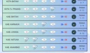 “Secara umum kondisi cuaca di kepri besok hari diprakirakan cerah berawan dan berpotensi terjadinya hujan dengan intensitas ringan hingga sedang di beberapa wilayah,”tulisnya dirilis update prakiraan cuaca.