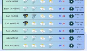Lalu, cuaca di Kabupaten Karimun, diprakirakan prakirakan cuaca pagi hari hujan petir, siang hingga dini hari berawan, suhu udara 26-32 derajat celcius dan angin bertiup dari barat laut dengan Kecepatan angin 10-15 Knot.