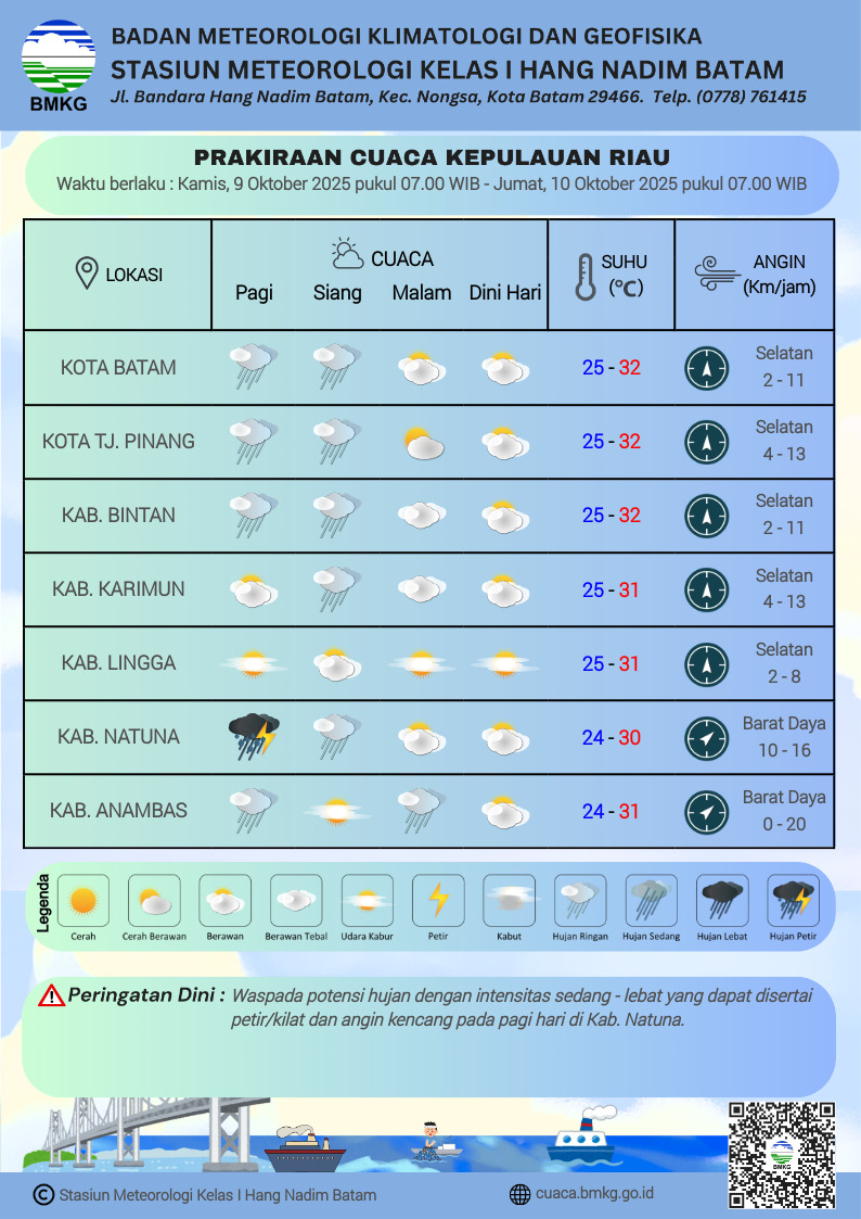 BATAM, Kepri.info – Badan Meteorologi, Klimatologi dan Geofisika (BMKG) Meteorologi Kelas I Hang Nadim Batam memprakirakan kondisi cuaca di tujuh wilayah Kepulauan Riau (Kepri) yang berlaku untuk Kamis (09/10/2025) dan Jum’at (10/10/2025).