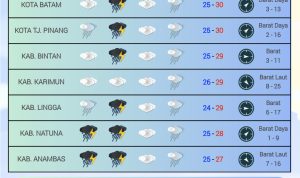 BATAM, Kepri.info – Badan Meteorologi, Klimatologi dan Geofisika (BMKG) Meteorologi Kelas I Hang Nadim Batam memprakirakan kondisi cuaca di tujuh wilayah Kepulauan Riau (Kepri) yang berlaku untuk Selasa (21/10/2025) dan Rabu (22/10/2025).