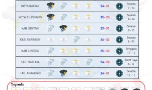 “Secara umum kondisi cuaca di Kepri esok hari diprakirakan berawan tebal dan berpotensi terjadinya hujan dengan intensitas ringan hingga lebat yang disertai kilat dan angin kencang. Waspada potensi hujan sedang hingga lebat dan disertai kilat pada pagi dan siang hari di wilayah Batam, Bintan, Tanjungpinang, Natuna dan Anambas, ” tulisnya dirilis update prakiraan cuaca.