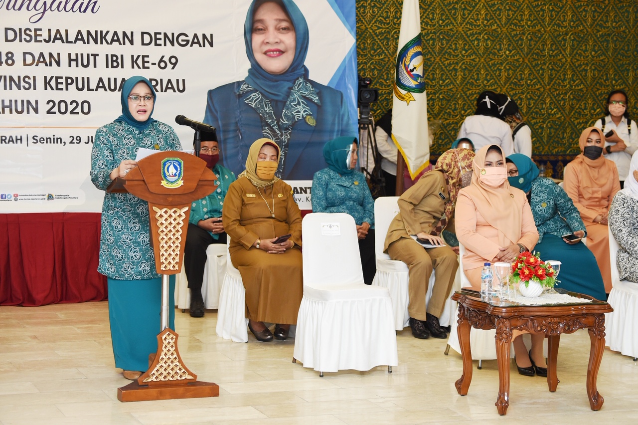 Sementara itu Ketua TP-PKK Provinsi Kepulauan Riau Hj. Meri Isdianto dalam laporannya menyampaikan bahwa berbagai rangkaian acara telah dilakukan dalam rangka Peringatan Hari Keluarga Nasional ke-24, Hari Kesatuan Gerak PKK ke- 48 dan HUT IBI ke 69 Provinsi Kepulauan Riau Tahun 2020.